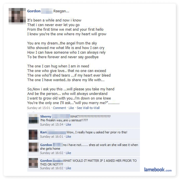He has the balls to do it on FB where it is almost public, and he definitely has it in his mind that her answer could be ‘NO’!