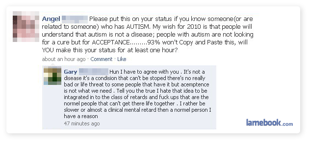 1. Anyone who posts such attention seeking nonsense in their status CLEARLY does not understand or respect those with a mental illness.. It’s Facebook.. Go 100% stupid and join an Autism Facebook group because that’s really going to make an impact on society.. Or better yet, become a fan of Autism.. Seriously change your fucking tampon and move right along..