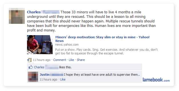 34. Lamebook, you realise that by posting these you are just giving these people the idea that they are funny. And that would only encourage them. And nobody wants that.What if they go on to try stand-up and the crowd gets so angry at how bad they are that they just straight up lynch them? Would you like that, lamebook?