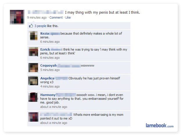 38. mcowels: “Masturbation is similar. You start out with black and white bra ads (missionary position) and build up to playboy (doggy style) and soon you’re watching transvestite porn while punching yourself over and over in the thigh (reverse cowgirl).” Ahh that seriously made me laugh out loud. Well done sir!