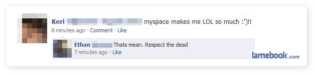 @ Keona: Firstly Keri and Ethan, it wasn’t an emo joke of any sort. Ethan was trying to get at, not to respect the dead because myspace is basically dead. In other words no one ever uses myspace anymore.