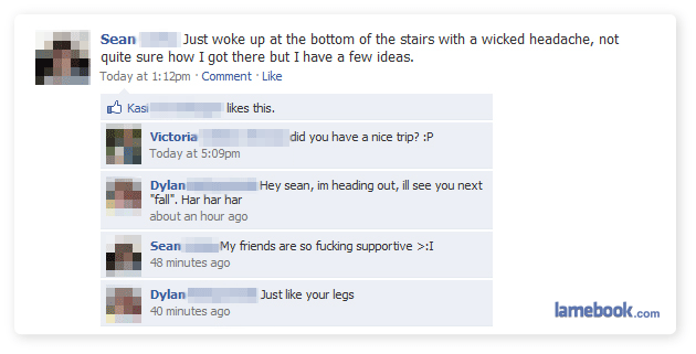 Sean, you ended up at the bottom of the stairs because I pushed you. Obviously, it didn’t work out too well if you’re posting it on facebook. You’re friends made up for it though.