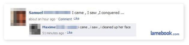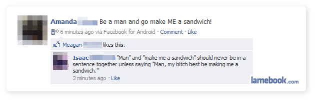 I’m liking the first one, almost worth stealing for my facebook status. The rest, meh. Another sandwich joke, how original. Go Lamebook!