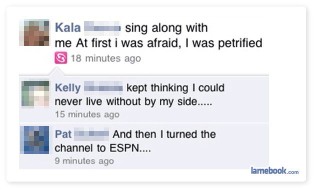 I personally can’t get enough ‘Where’s Waldo’ jokes….. haha. Then again, I’ve been known to post song lyrics to my wall before. However, I don’t recall asking people to sing along with me. That’s new. Actually, does it count if they are posted along with a youtube link???