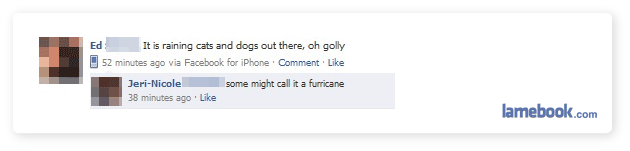 First one is from How I Met Your Mother. Lily actually says, “What did they make you call tropical storm Heather when it was raining cats and dogs?” and Robin answers, “A furricane.”