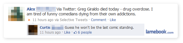 Yeah, I called the Greg Giraldo jokes. The guy was cool cool though, he had great material. Too bad this crap joke is the first thing I get to see on Lamebook today. I’m taking moment of silence.