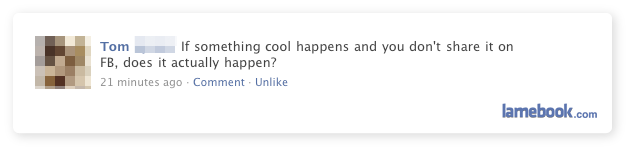 I’m actually with alordslums and 83. I think that some people, instead of enjoying a moment, they need to share it in Facebook so it’s “real”. What Tom says is exactly why I don’t need to be on Facebook.